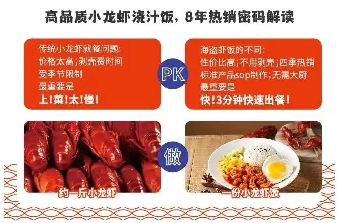 海盜蝦飯成立于2015年,創(chuàng)始團(tuán)隊(duì)來自華為、百度等互聯(lián)網(wǎng)企業(yè),在標(biāo)準(zhǔn)化定義、信息化建設(shè)、供應(yīng)鏈整合和品牌營銷等領(lǐng)域具有天然優(yōu)勢(shì);獲得海底撈千萬戰(zhàn)略投資,央視等多家權(quán)威媒體相繼報(bào)導(dǎo)。作為小龍蝦飯代表品牌,重構(gòu)超級(jí)品類和消費(fèi)場(chǎng)景,特色與剛需并備,化低頻消費(fèi)為高頻享受,被譽(yù)為“工作餐拯救者”。