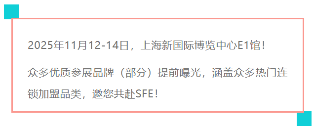 11月12-14日,2025年收官大展。SFE第40屆上海國際連鎖加盟展覽會(huì)將在上海新國際博覽中心E1館隆重舉辦!